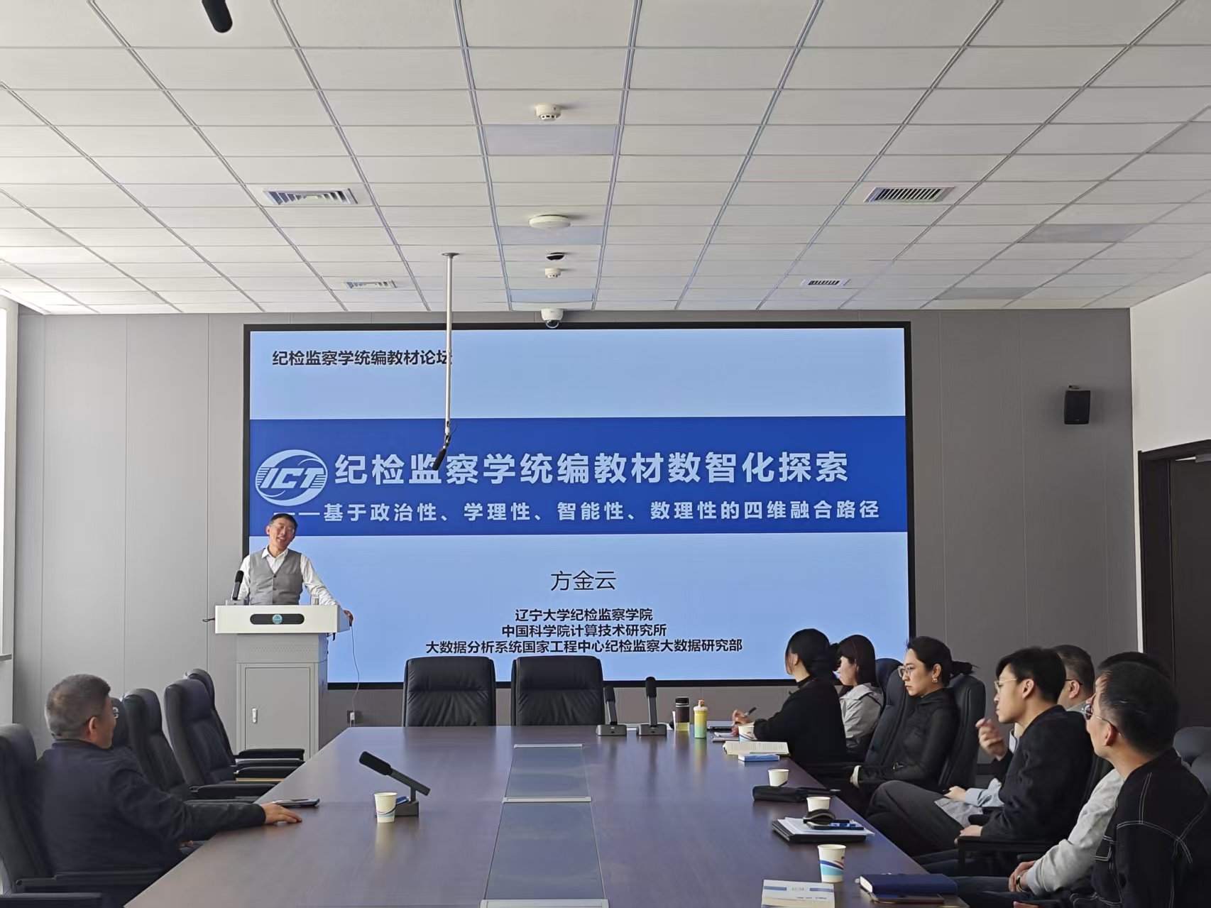 为积极响应辽宁大学人工智能学科建设工作部署,加快推进纪检监察学科数智化教学创新与教材体系落地转化,辽宁大学纪检监察学院于 2026年4月21日召开“人工智能建设与纪检监察教材体系向教学体系转化”座谈会。会议围绕教材与教学实践的衔接路径展开深入研讨。此次座谈会由辽宁大学纪检监察学院院长王喜满主持,中国科学院计算技术研究所、大数据研究院国家工程中心纪检监察大数据研究部、辽宁大学特聘教授方金云研究员担任主讲嘉宾,学院教师代表共同参与了此次研讨。